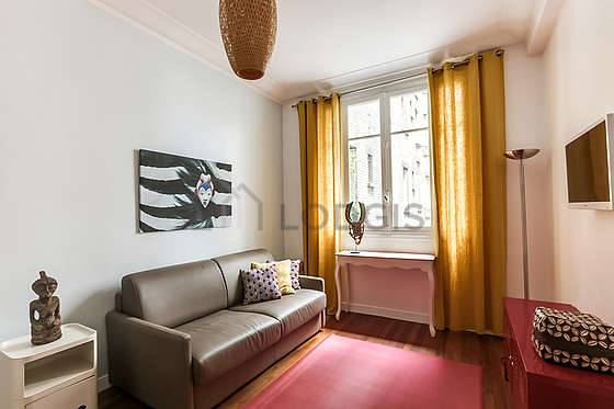 SalaõEste apartamento é composto de um atraente salão com parqué no piso é janelas é vista sobre pátio. Este salão very quiet mobiliado et equipado para uma agradável estância : televisaõ, lençois, colchas, mesinha, roupeiro, prateleira, armário, 2 cadeira(s), mesinha de cabeceira1 sofá-cama.