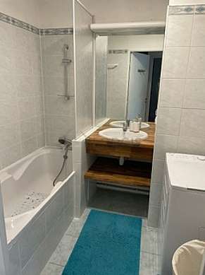 Este apartamento é equipado de uma casa de banho agradável. Esta sala de água dispõe do necessário pelo seu bem estar na sua vida quotidiana : toalhas de banho, armário, banheira, secador, radiator secador de toalhas. Os WC são separados da casa de banho e situados em uma peça independente.