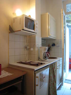 Este apartamento tem uma cozinha perto do salaõ com azuleijo no piso e todo o equipamento pela sua vida quotidiana : fogaõ, frigorífico, microondas, torradeira, chaleira, máquina de café, armário, loiça.