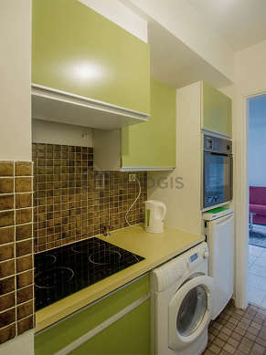 Este apartamento tem uma cozinha com azuleijo no piso e todo o equipamento pela sua vida quotidiana : fogaõ, frigorífico, forno, freezer, torradeira, máquina de café, armário, loiça.