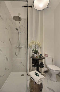 Este apartamento é equipado de uma casa de banho agradável é clara. Esta sala de água dispõe do necessário pelo seu bem estar na sua vida quotidiana : toalhas de banho, armário, ducheiro separado, sink. Os WC são separados da casa de banho e situados em uma peça independente.