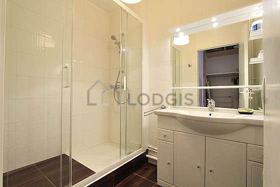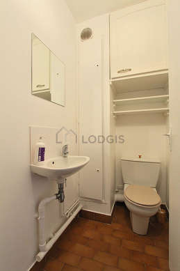 Este apartamento é equipado de uma casa de banho agradável. Esta sala de água dispõe do necessário pelo seu bem estar na sua vida quotidiana : toalhas de banho, armário, ducheiro separado. Os WC são separados da casa de banho e situados em uma peça independente.