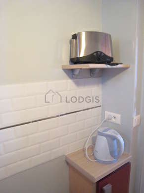 Este apartamento tem uma bonita cozinha com azuleijo no piso e todo o equipamento pela sua vida quotidiana : fogaõ, frigorífico, micro-ondas combinado, freezer, torradeira, chaleira, armário, loiça.