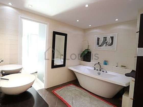 Este apartamento é equipado de uma casa de banho magnífico. Esta sala de água dispõe do necessário pelo seu bem estar na sua vida quotidiana : toalhas de banho, prateleira, banheira, radiator secador de toalhas. Os WC são separados da casa de banho e situados em uma peça independente.