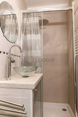 Este apartamento é equipado de uma casa de banho magnífico é clara. Esta sala de água dispõe do necessário pelo seu bem estar na sua vida quotidiana : toalhas de banho, prateleira, armário, ducheiro separado, secador, sink, radiator secador de toalhas. Os WC são integrados na casa de banho.
