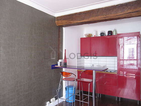 Este apartamento tem uma bonita cozinha com parqué no piso e todo o equipamento pela sua vida quotidiana : fogaõ, frigorífico, microondas, torradeira, chaleira, máquina de café, armário, loiça, banco, bar.