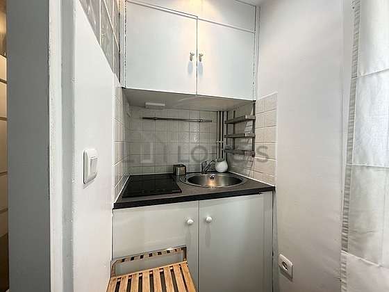 Este apartamento tem uma bonita cozinha com parqué no piso e todo o equipamento pela sua vida quotidiana : fogaõ, frigorífico, microondas, freezer, torradeira, chaleira, máquina de café, armário, loiça, plates, bowl, casserole dish, cutlery, mugs, work surface, stove, water glass.