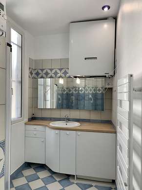Este apartamento é equipado de uma casa de banho agradável é muito clara with janelas. Esta sala de água dispõe do necessário pelo seu bem estar na sua vida quotidiana : toalhas de banho, prateleira, armário, ducheiro separado, secador, radiator secador de toalhas. Os WC são integrados na casa de banho.