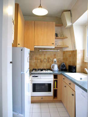 Este dúplex tem uma bonita cozinha com azuleijo no piso e todo o equipamento pela sua vida quotidiana : fogaõ, frigorífico, congelador, forno, microondas, exaustur, chaleira, máquina de café, prateleira, armário, loiça.