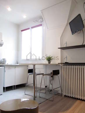 Este apartamento tem uma bonita cozinha com azuleijo no piso e todo o equipamento pela sua vida quotidiana : fogaõ, frigorífico, micro-ondas combinado, exaustur, torradeira, chaleira, máquina de café, prateleira, armário, loiça, banco, bar.