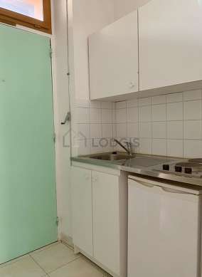 Este apartamento tem uma cozinha e todo o equipamento pela sua vida quotidiana : fogaõ, frigorífico, micro-ondas combinado, prateleira, loiça.