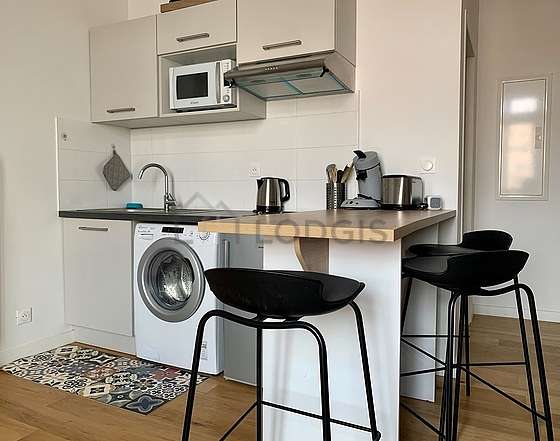 Este apartamento tem uma cozinha perto do salaõ e todo o equipamento pela sua vida quotidiana : fogaõ, frigorífico, micro-ondas combinado, exaustur, torradeira, chaleira, máquina de café, prateleira, armário, banco, work surface.