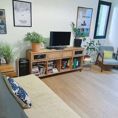 Este apartamento é composto de um salão com parqué no piso é janelas. Este salão mobiliado et equipado para uma agradável estância : televisaõ, sofá, 1 poltrona(s), mesa de jantar, 1 cadeira(s).