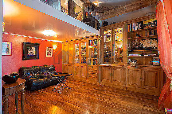 Телевизор - Диван - 1 Кресел - Журнальный столик - Библиотека - Стенной шкаф - Балка - TV stand