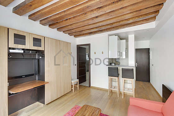 ГостинаяТелевизор - Простыни - Одеяло - Холодильник - 1 Кресел - Стол - Журнальный столик - Бюро - Гардероб - Библиотека - Полка - Шкаф - Стенной шкаф - Посуда - 1 Стульев - Ночной столик - TV stand - Mirror - coat stand - bin - carpet