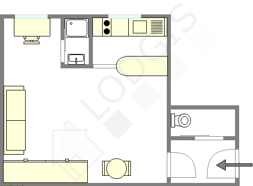 Плитка - Холодильник - Духовка - Морозилка - Тостер - Электрический чайник - Кофейник - Полка - Стенной шкаф - Посуда - Бар