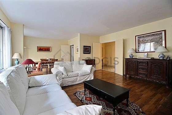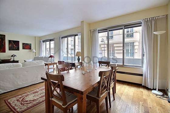 Living roomThis apartment consists of a wonderful living room with wooden floor and its windows. This very quiet living room is furnished and equipped for a comfortable stay: tv, sofa, dining table, shelves, cupboard, 1 chair(s).