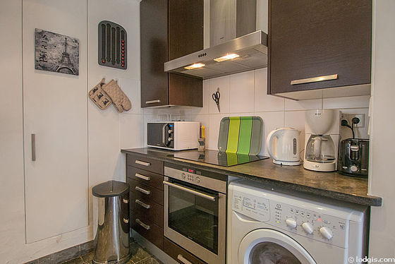 This apartment consists of beautiful kitchen with tile floor and all the necessary equipment for your daily life: hob, refrigerator, freezer, oven, microwave oven, extractor hood, kettle, coffee-maker, shelves, cupboard, crockery.