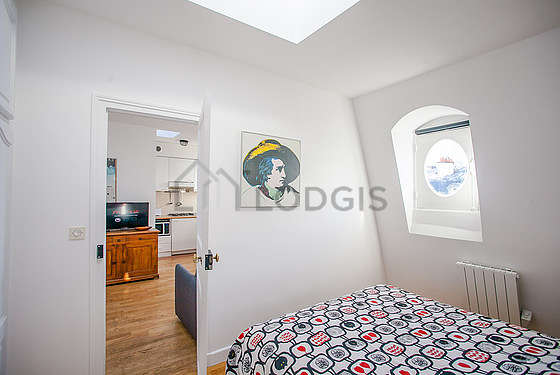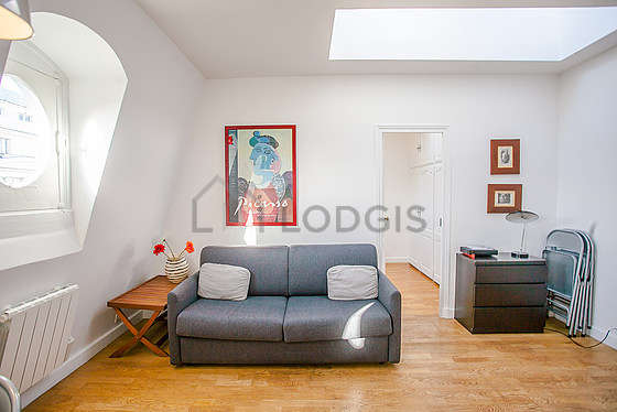 Living roomThis apartment consists of a living room with wooden floor and its windows. This living room is furnished and equipped for a comfortable stay: tv, linen, quilt, sofa, dining table, storage space, 1 chair(s).