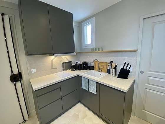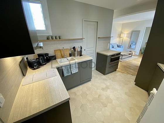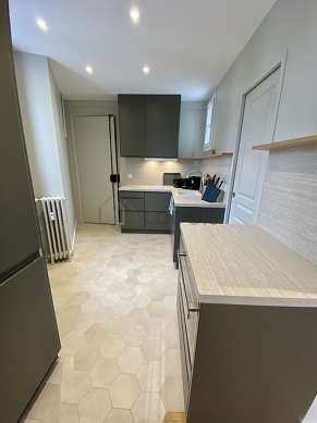 This apartment consists of kitchen and all the essential equipment for your daily life: hob, refrigerator, freezer, oven, freezer, coffee-maker, cupboard, crockery, dessert plates, plates, casserole dish, chopping board, work surface, teatray, stove, bin, ceiling light, tea pot.